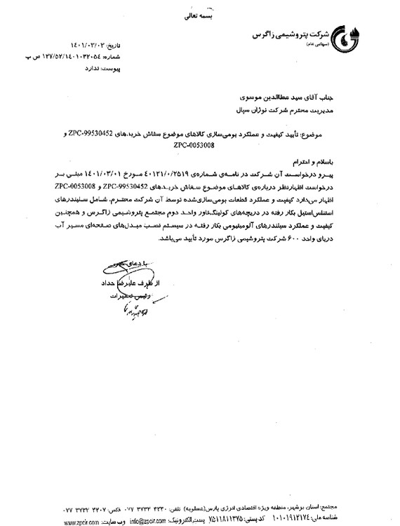 SPECIAL HYDRAULIC CYLINDER CUSTOMER APPRECIATION LETTER, ZAGROS PETROCHEMICAL CO.