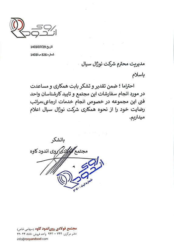 CORRUGATED METAL HOSE CUSTOMER APPRECIATION LETTER, ROOY ANDOOD KAEVEH CO.